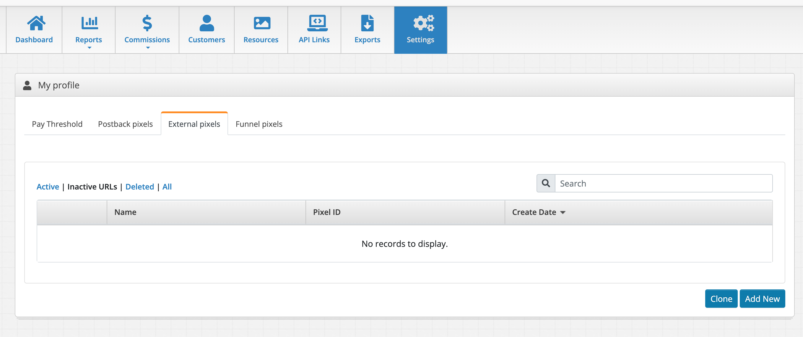 - Click on Settings and Choose the External Pixels tab and click on "Add New"